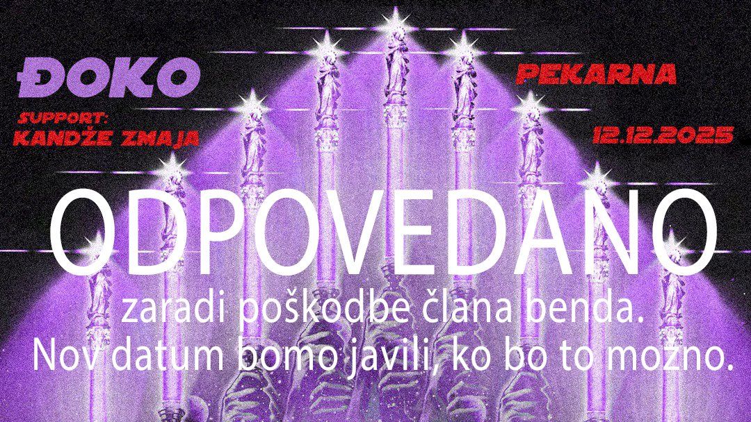 ĐOKOti sporočajo: "dragi & drage, koncert bomo morali zaradi poškodbe prestavit na naslednje leto. neizmerno smo se veselili koncerta, da letošnje leto primerno zaključimo. višja sila pač. folk, ki je kupil karte - veljajo za naslednji datum, možen pa je refund na mailu, ki ste ga prejeli. NOV DATUM JAVIMO NEMUDOMA, vidimo se naslednje leto, radi vas mamo"
