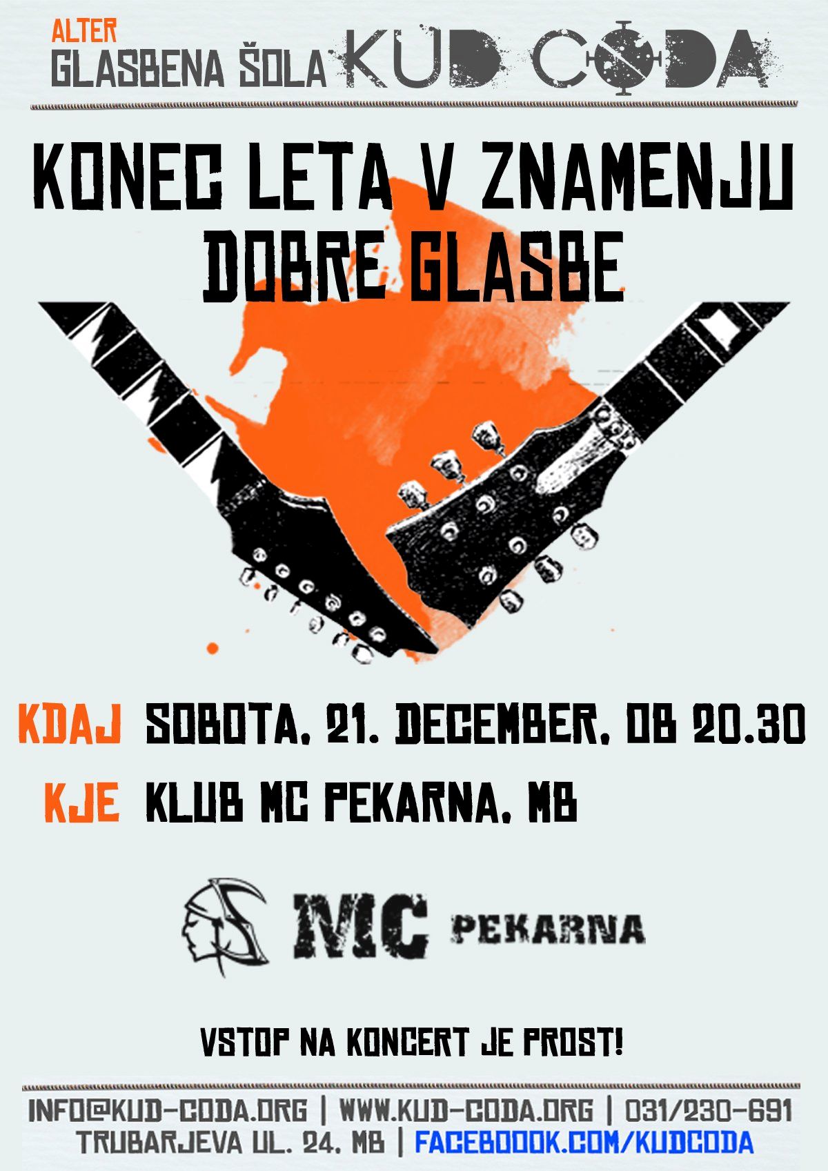 Koncert KUD Coda predstavlja odlično alternativo preposlušanim božičnim uspešnicam, ki nas obdajajo v decembru. Učenci KUD Coda in njihovi mentorji so pripravili nekaj za vsak okus. V Klubu MC Pekarna se boste lahko predali glasni in električni glasbi. Za vse, ki pa vas premamijo malce mirnejši in akustični zvoki, pa pripravljajo koncert že nekaj dni prej v Jazz klubu Satchmo.